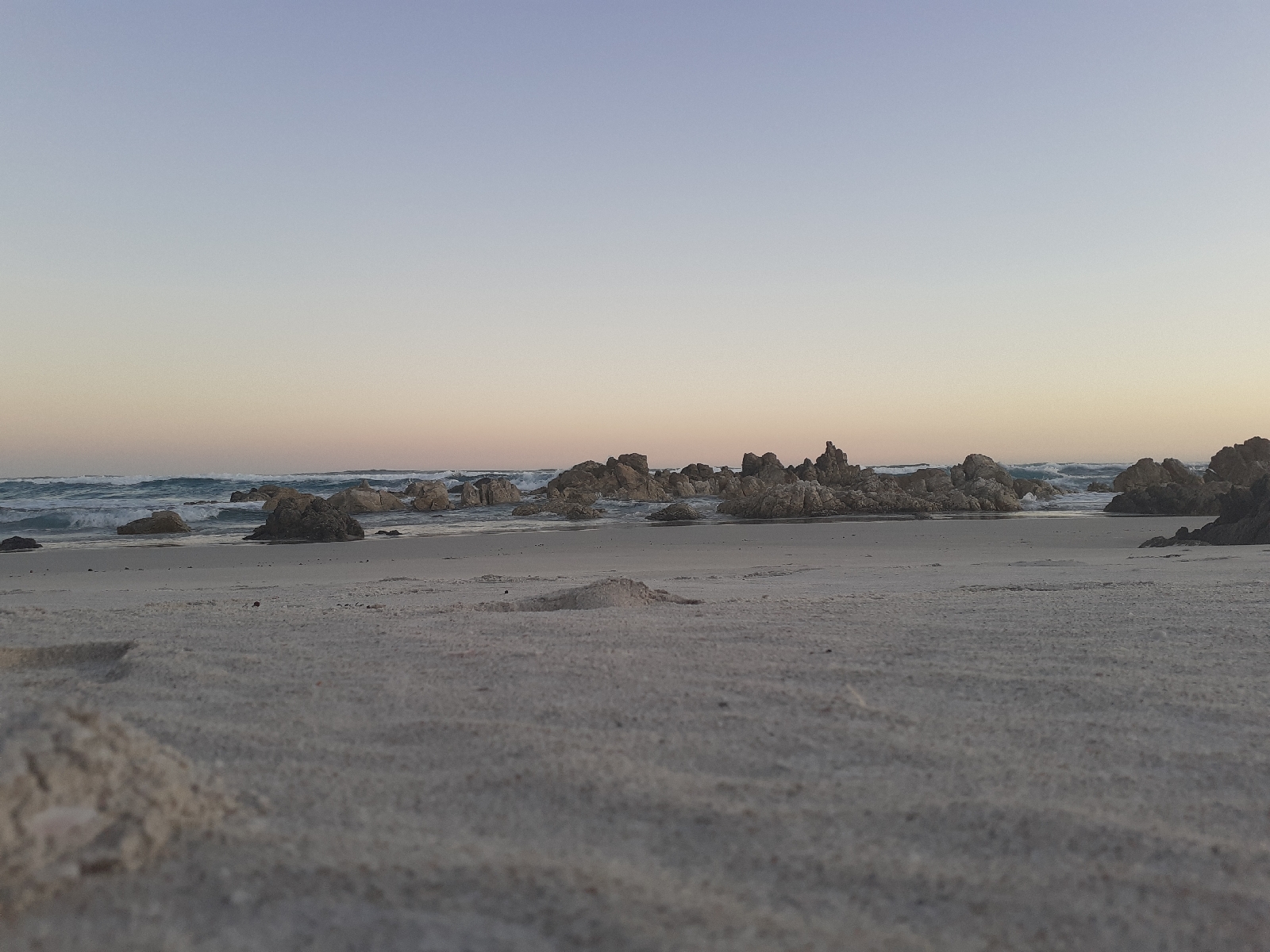 We were kind of stuck at the bush camping - it's Bank holiday here and everywhere (except our camping.. too far out) is busy- it's hard to find somewhere other than laybys to sleep in and we didn't want to spend the whole weekend in a lay-by.... not even Dr Fred!!!! So being here a couple of extra days and having time to explore we decided, as it was a good evening we would walk to the beach it's about a 5K return walk through the bush. That isn't that far unless it's 36 degrees as it has been.... but the evenings are cooler and we hoped that on the way back in the dusk we might spot kangaroo! We took some beer and water and set off through the bush. It was a very clear and sandy path and it went up and down and seem to go on forever... we could hear the sea and caught glimpses of it in the trees ...but we never seem to get any nearer. There was no evident wildlife and at one point we did think we'd taken the wrong path. After what seemed like long time but in reality was just about right to walk the distance we arrived at an immense stretch of white sand just as the light started to fade. We definitely walked another half k to get to the sea which was fairly wild and making some enormous waves. The rocks were all very jaggy and so we sat on the sand and had a drink and contemplated the doomed planet. The sky was amazing as the sun went down - every shade of orange and gold gave way to deep purple's and blues.the beaches in this part of the world are clean -no plastic, no debris - a lot of shell particles and cuttlefish but so far no the treasure, but it's early days... and really I don't want to find anything too exciting as I can't bring it home!
